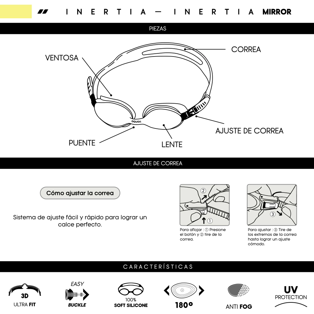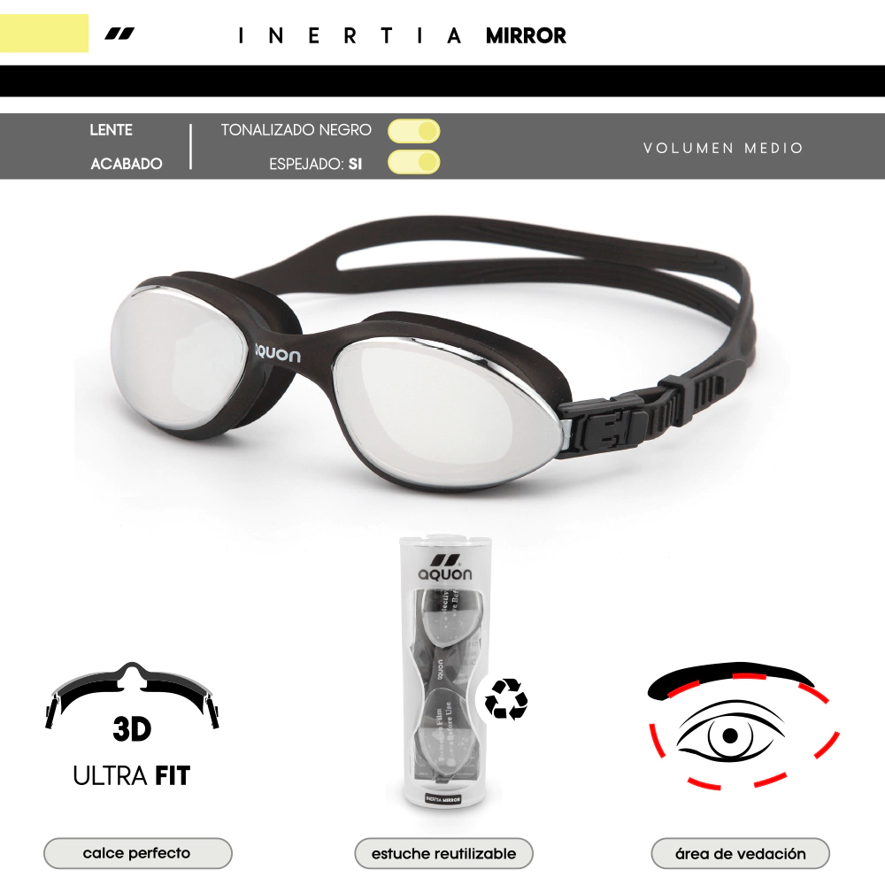 La Inertia Mirror es una antiparra diseñada para lograr el mayor rendimiento y confort durante la práctica de natación en aguas abiertas. Permite una visión amplia a través de un lente tonalizado negro con tratamiento espejado, que la hacen especialmente apta para esta actividad, ya que ayuda a la mejor orientación del nadador. El recubrimiento espejado refleja parte de la luz que incide sobre ella, reduciendo el brillo del sol y evitando que el nadador quede deslumbrado.