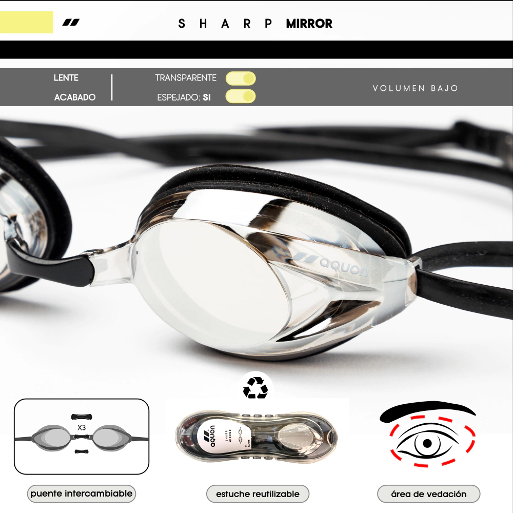 La Sharp Mirror es una antiparra de volumen interno bajo diseñada para la natación en pileta. Su perfil hidrodinámico con baja resistencia al agua, la hace ideal para quienes buscan velocidad en distancias cortas. Tanto para competencias como entrenamientos.