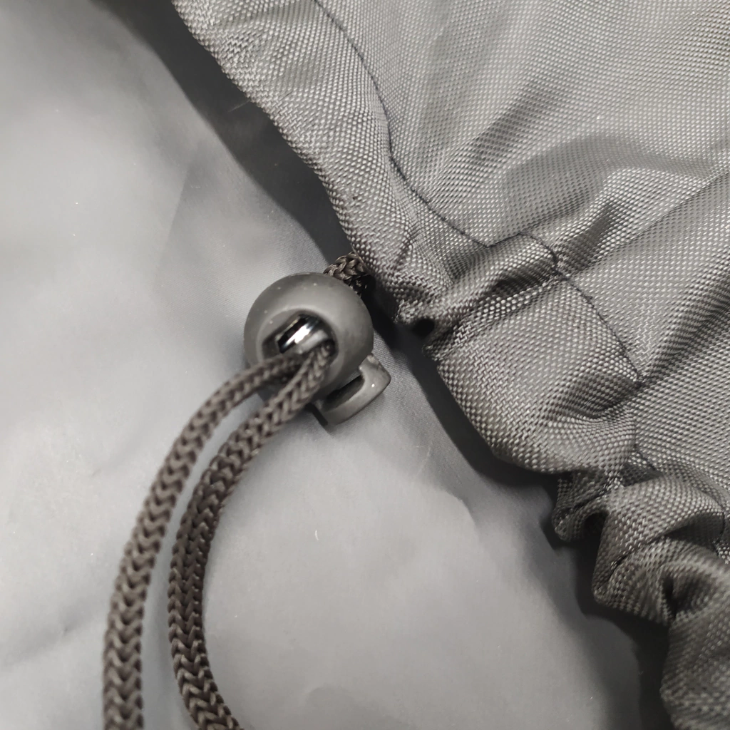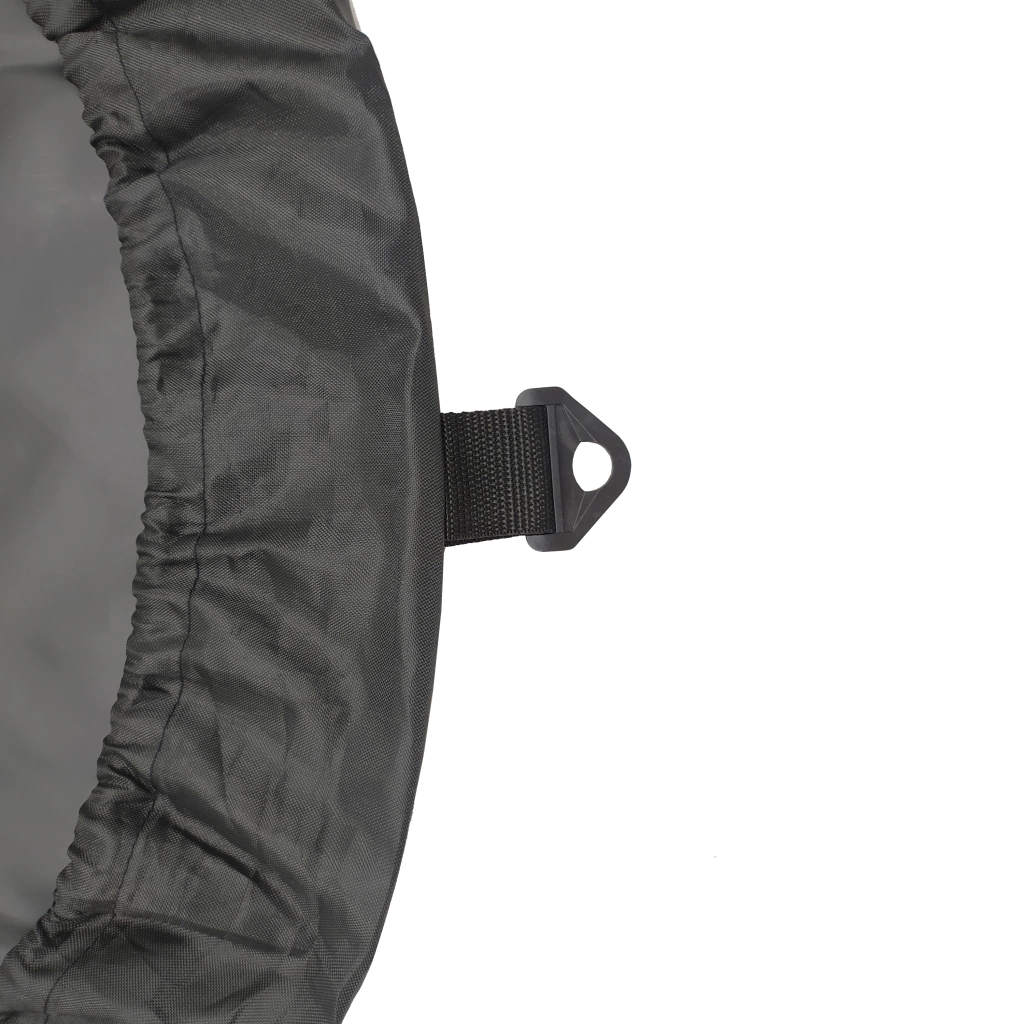 Fabricado con tejido robusto de 420D y revestimiento de PVC, que lo hace totalmente impermeable. Cordón elástico para cerrarlo convenientemente y convertirlo en una bolsa gracias a sus dos correas de agarre laterales.
